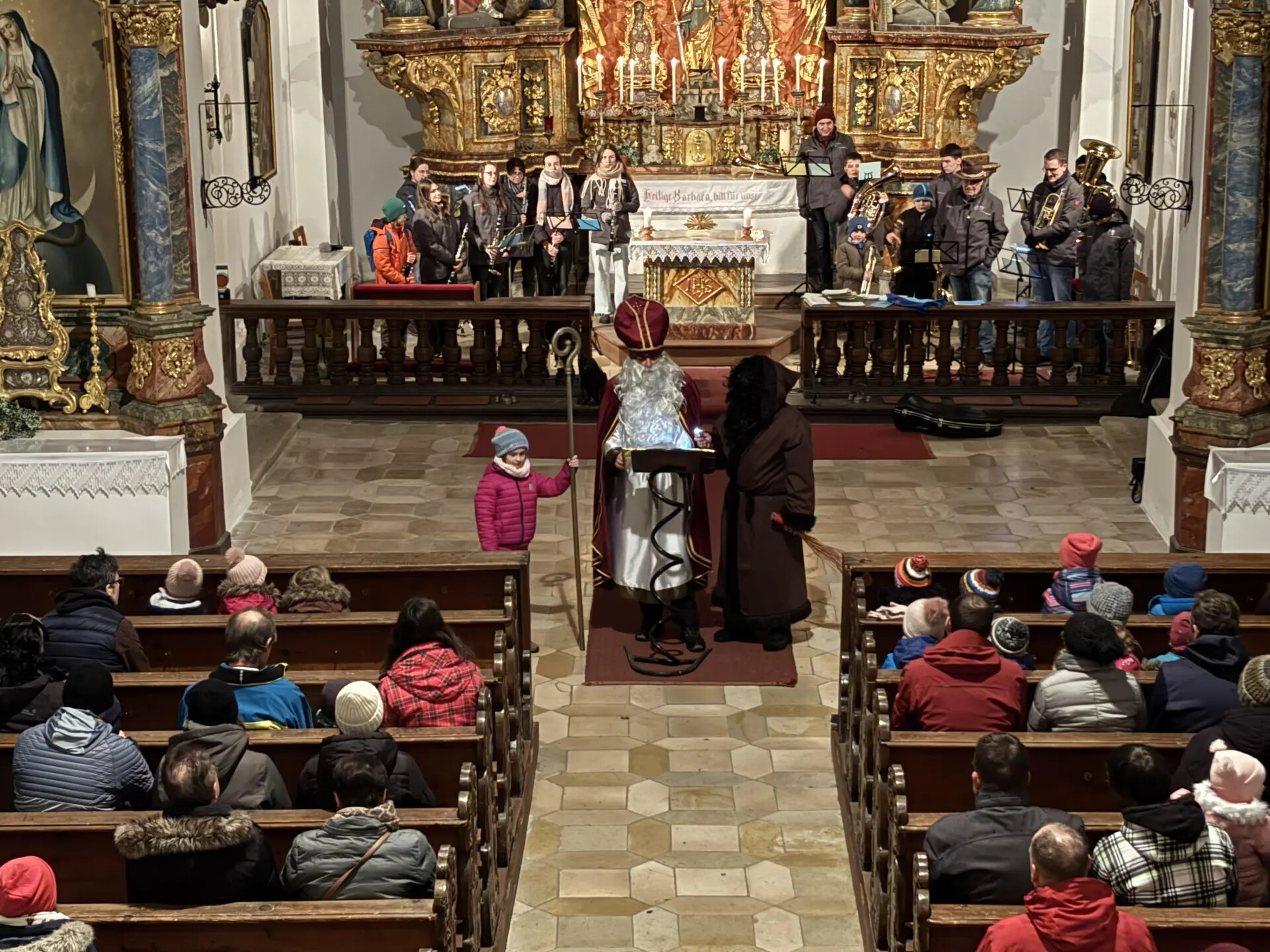Als schließlich gegen 16:30 Uhr die Glocken der St. Barbara Kirche zu läuten begannen, war es endlich so weit. Bischof Nikolaus trat mit seinem treuen Begleiter Knecht Ruprecht aus der Kirche heraus und ging den Kindern entgegen. Im Kreise der Mädchen und Jungen angekommen, wusste St. Nikolaus über jede und jeden etwas zu berichten. Scheinbar waren aber nur brave Kinder auf den Eixlberg gekommen, denn alle wurden mit einem Geschenk bedacht.